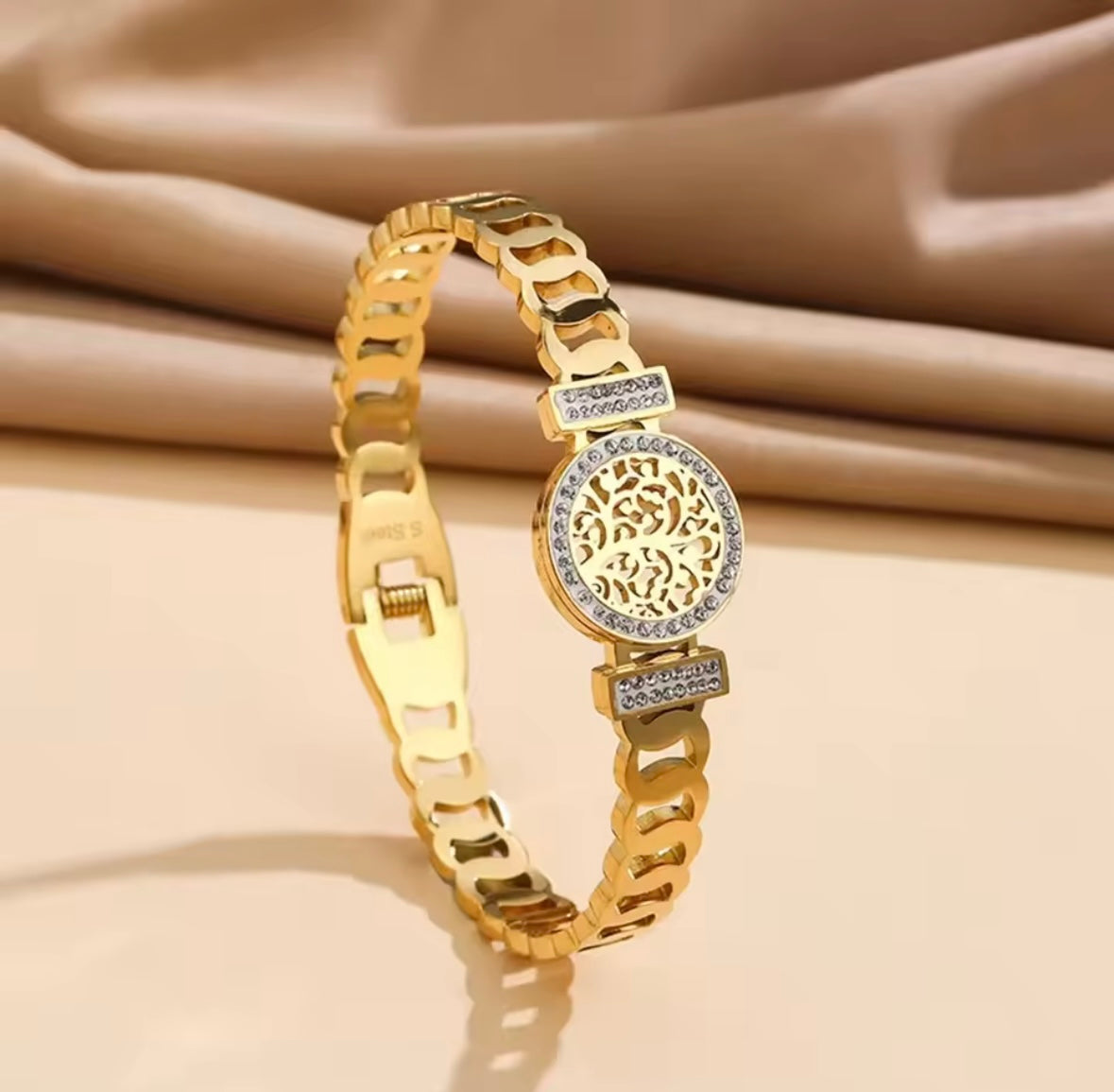 Precioso brazalete de acero inoxidable dorado.Nuestro acero está garantizado para resistir al agua, los perfumes, al agua de mar, al cloro de la piscina y mucho más.